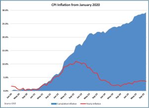 You can see this in the graph above – the red line is yearly CPI inflation and the blue area is the cumulative rise in prices since January 2020. As the end of 2025 approaches, overall prices (based on October’s CPI) are almost 30% higher than in January 2020 – an effective 5.5% average yearly inflation rate.